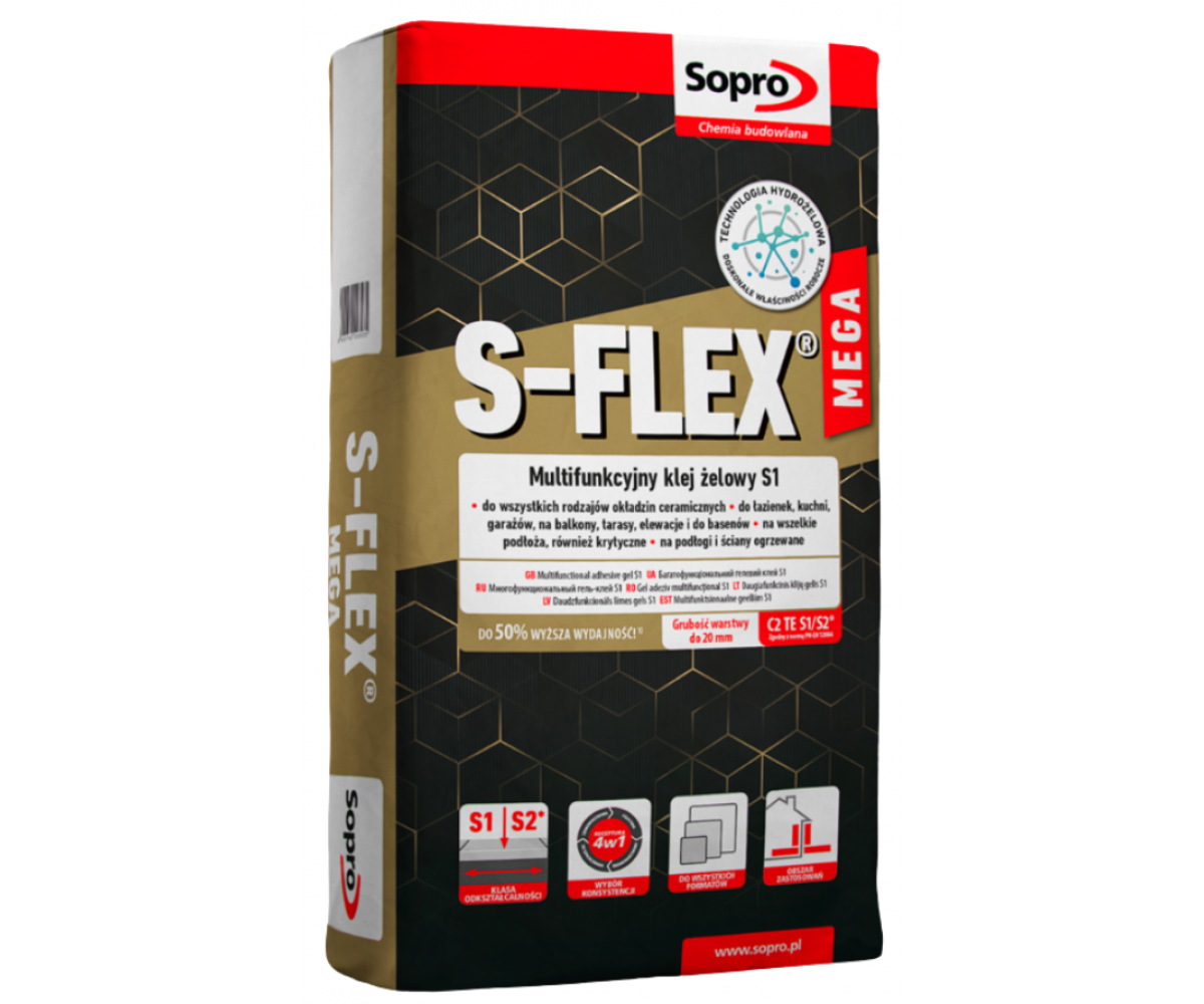 S-FLEX® mega – labai elastingi, deformuojantys cementiniai plytelių klijai su hidrogelio technologija, skirti visų tipų ir formatų dangoms klijuoti. Tinka keraminėms, porcelianinėms, mozaikinėms plytelėms bei natūraliam akmeniui tiek vidaus, tiek lauko darbams.
