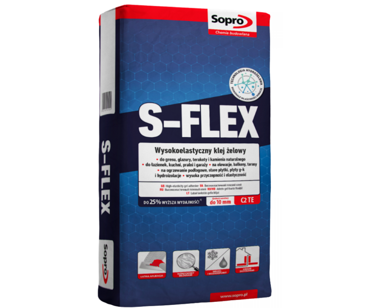 Sopro S-FLEX – didelio elastingumo cementinis plonasluoksnis klijų skiedinys su hidrogelio technologija, skirtas įvairių tipų grindų ir sienų dangų klijavimui. Tinka naudoti gyvenamosiose, komercinėse ir pramoninėse patalpose, taip pat drėgnose ir šlapiose zonose, ant šildomų grindų bei lauko sąlygomis – balkonuose, terasose, laiptuose ir fasaduose.