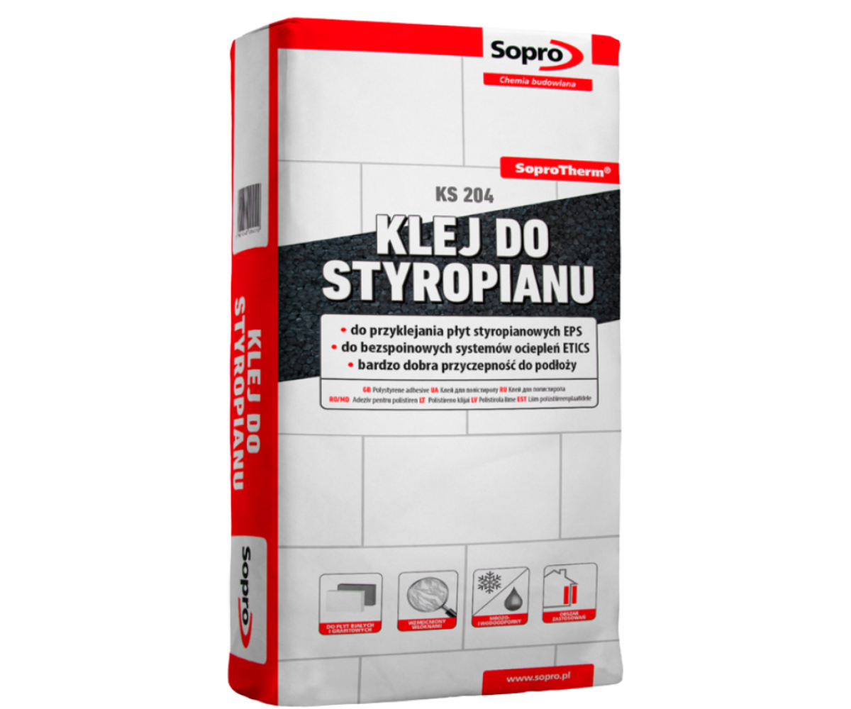 SoproTherm KS 204 – cementiniai klijai, skirti baltų ir grafito EPS polistireninio putplasčio plokščių klijavimui ETICS fasadų sistemose. Taip pat tinkami nedideliems pagrindo nelygumams išlyginti ir vietiniams remonto darbams naujos statybos bei renovacijos projektuose.