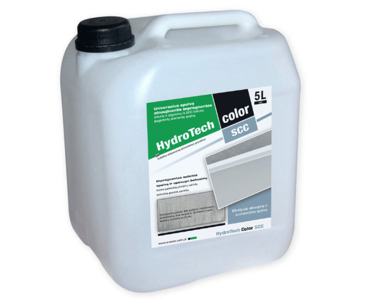 HydroTech Color SCC – akrilinių dervų pagrindu pagamintas impregnantas, skirtas betoninių paviršių spalvai atnaujinti ir suvienodinti. Suteikia apsaugą nuo atmosferos poveikio bei padeda atkurti estetinę išvaizdą. Tinka tiek naujiems, tiek seniems betoniniams elementams su spalvos pakitimais ar dėmėmis.
